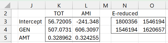 Here range K3:L5 contains the array formula (with reference to Figure 1 of Multivariate Regression Testing Example). E in range N3:O4 is calculated as for E for the full model in range M7:N8 of Figure 2 in Multivariate Regression Testing Example.