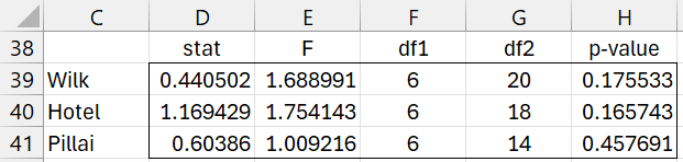 Matrix E in range N7:O8 is copied from M7:N8 of Figure 2 in Multivariate Regression Testing Example. Matrix H in range Q7:R8 is calculated by the formula =N3:O4-N7:O8. All the other entries in Figure 3 are calculated in the same manner as in Figure 2 in Multivariate Regression Testing Example.