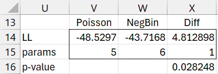 Here, the Poisson regression values in cells V14 and V15 come from cells R14 and R8 of Figure 1. The corresponding values for the Negative Binomial regression in cells W14 and W15 are copied from cells R14 and R8 of Figure 2 of Negative Binomial Regression Tool (Solver).