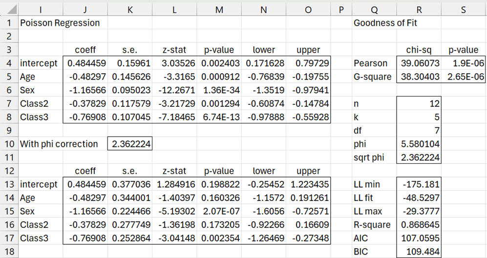 We start by creating a Poisson regression model for the Titanic data in Figure 1 of Negative Binomial Regression Tool (Solver). Figure 1 shows the partial results.