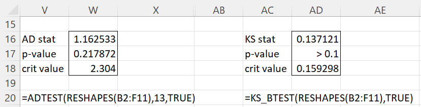 For the AD test, we see that AD_BSTAT(RESHAPES(B2:F11)) = 1.162533, ADCRIT(,0.05,13) = 2.304, and ADPROB(P16,”benford”) = .217872.
