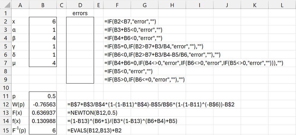 We do this by finding the value of p that satisfies the equation F-1(p) – x = 0 using Newton’s method (see Root Finding Functions). The left side of this equation is inserted in cell B12 (as shown in cell D12). The Real Statistics formula to estimate p is inserted in cell B13 (as shown in cell D13).