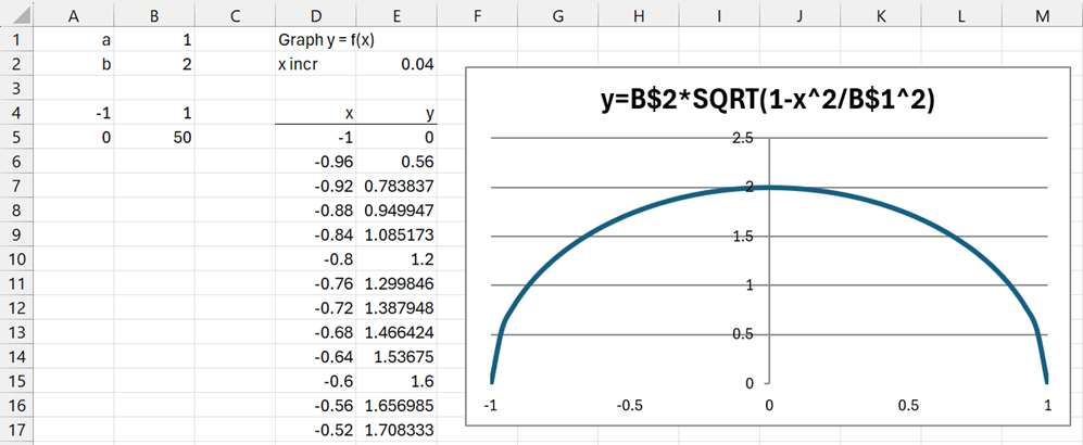We can also calculate the area using Real Statistics’ INTEGRAL formula (see Numerical Integration Function). First, we use the Graph y = f(x) data analysis tool, as described in Graphing y = f(x), to draw the top half of the ellipse, as shown in Figure 1. Here, cell A5 contains the formula =B$2*SQRT(1-A4^2/B$1^2).