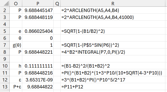 Referring to Figure 1, for an ellipse with a = 1 and b =2, we use the formula =2*ARCLENGTH(A5,A4,B4) to obtain an estimate of 9.688445147, as shown in cell P2 of Figure 2. If we increase the number of intervals, we obtain the estimate of 9.688448119, although more intervals don’t necessarily lead to a better estimate.