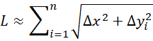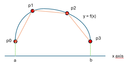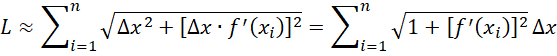 Here, we use n = 3. The length of the curve y = f(x) between x = a and x = b is approximated by the sum of the n line segments. If point pi = (xi, xi+1), then the sum of these line segments is