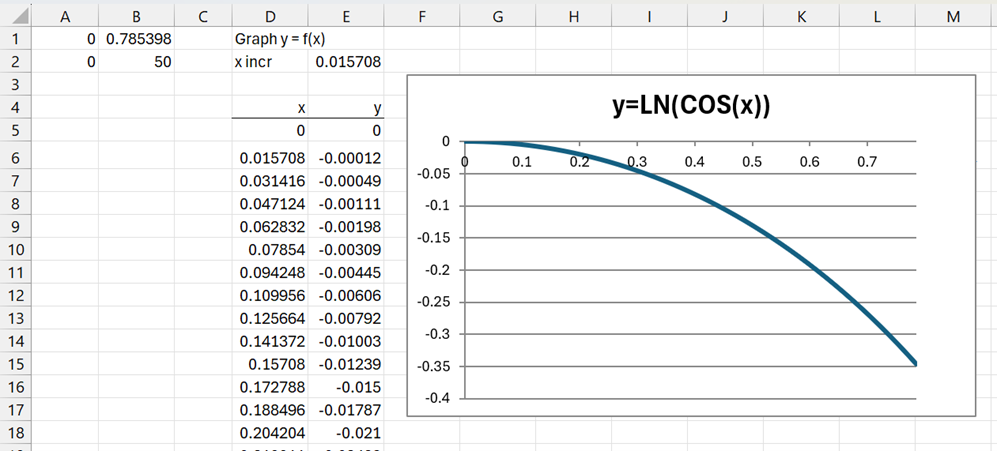 We first create a chart of the function y = ln(cos(x) using the Graph y = f(x) data analysis tool, as shown in Figure 2. This chart can be obtained as described in Graphing y = f(x).