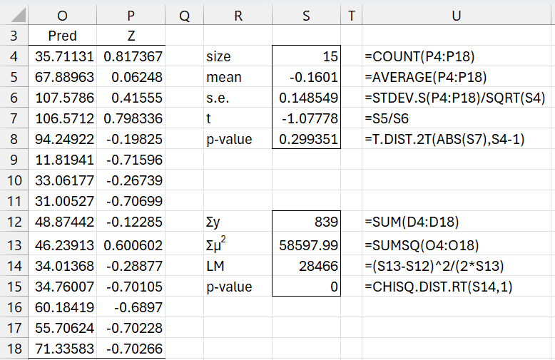 The mu values in column O are copied from column Q of Figure 3 in Poisson Regression using Solver. The z values are calculated by placing the formula