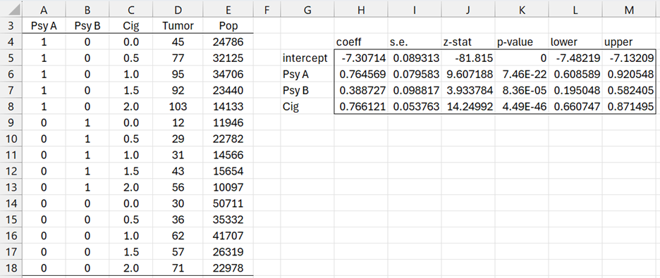 =Poisson_STest(A4:C18,D4:D18,H5:H8,TRUE,E4:E18)