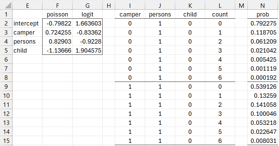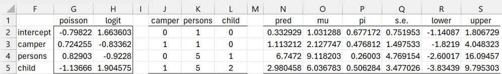 For Example 1 of Creating ZIP Regression Models, we can use the ZIP regression coefficients (repeated in range F1:H5 of Figure 1) to make predictions as shown in Figure 1.