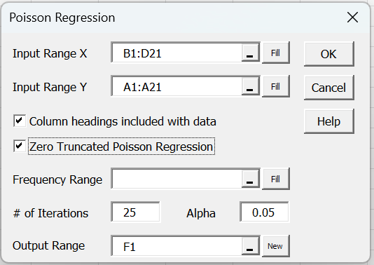 Note that we need to check the Zero Truncated Poisson Regression option. Also note that since the software will use Solver, the # of Iterations field won’t be used.