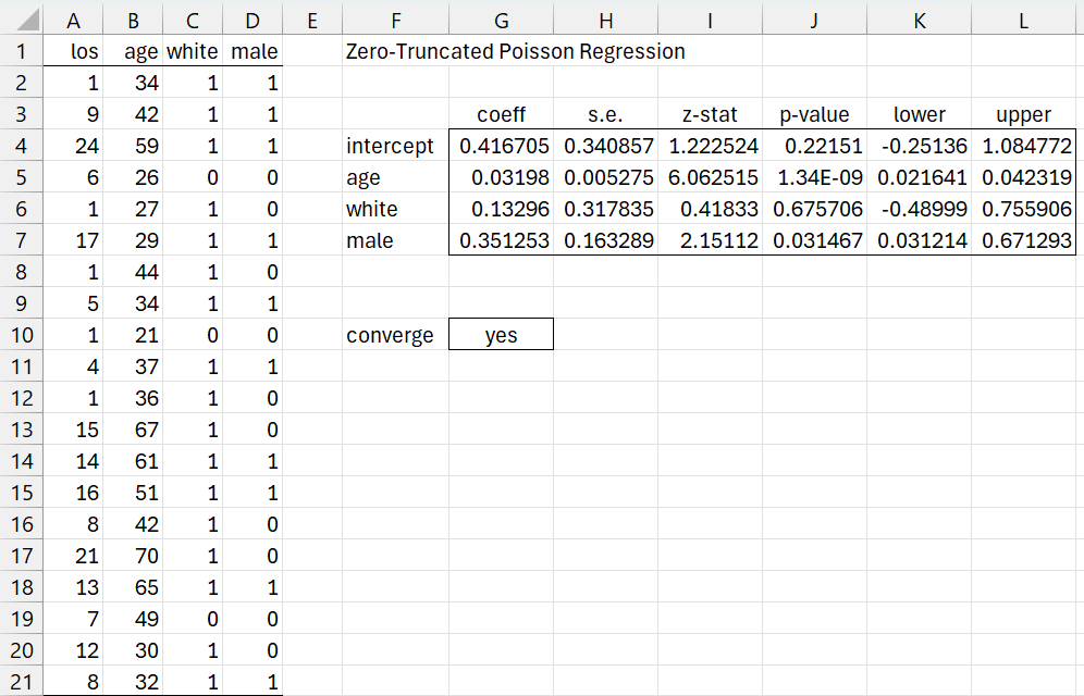 Example 1: Fit the data in columns A-D of Figure 1 to a ZTP regression model. Here, los = length of hospital stay.