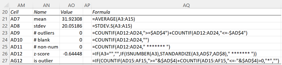 If you change any of the values in Figure 1 (including changing a numeric value to a non-numeric value or vice versa), the values output in Figure 2 will change accordingly. You can also change the Outlier Limit value in cell AD4 and whether an asterisk appears in column AG will change accordingly.