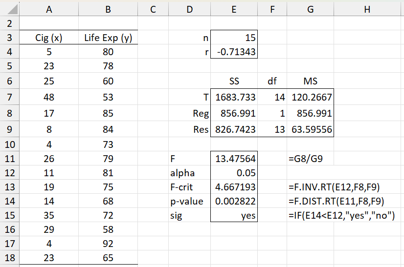 We now calculate the test statistic F = MSReg/MSRes = 857.0/63.6 = 13.5. Since Fcrit = F.INV(α, dfReg, dfRes) = F.INV(.05, 1, 13) = 4.7 < 13.5 = F, we reject the null hypothesis, and so accept that the regression line is a good fit for the data (with 95% confidence). Alternatively, we note that p-value = F.DIST.RT(F, dfReg, dfRes) = F.DIST.RT(13.5, 1, 13) = 0.0028 < .05 = α, and so once again we reject the null hypothesis.