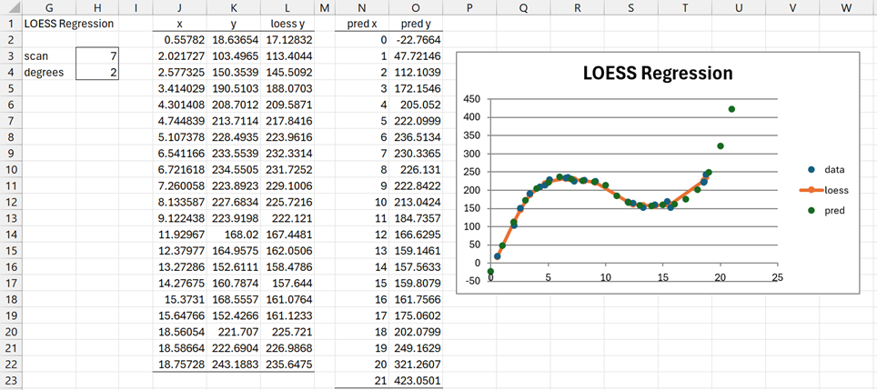 We once again use the LOESS Regression data analysis tool, as described above. This time we insert E2:E23 in the Pred Range X field and choose the Degrees = 2 option. The output is shown in Figure 4.