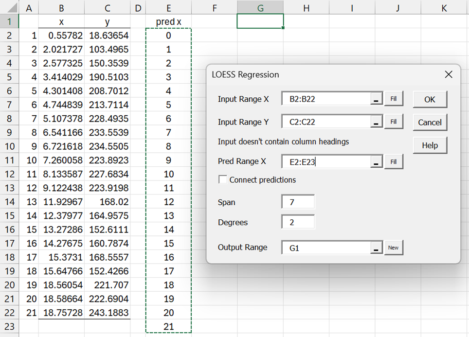Note that if the Span field is left blank, then its value defaults to INT((m+Degrees+2)/3) where m = the number of elements in Input Range X. For this example m = 21, and so Span would take the value of 8.