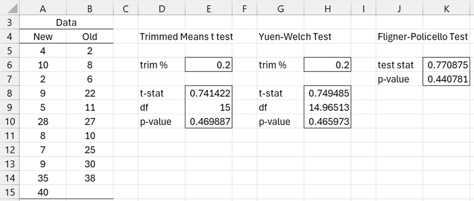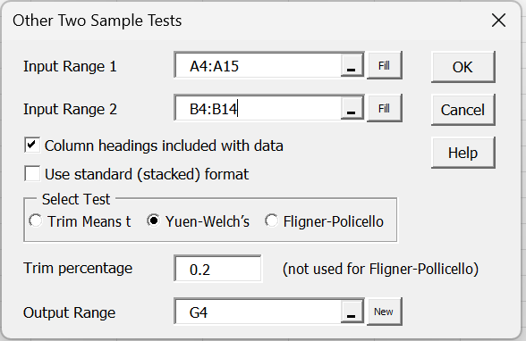 As described in When t Test Assumptions are Violated, there are a number of substitute tests that can be used when the t Test assumptions don’t hold. We now describe a data analysis tool that can be used for three of these tests. Namely, the Trimmed Means t Test, Yuen-Welch’s t Test, and the Fligner-Policello non-parametric test.