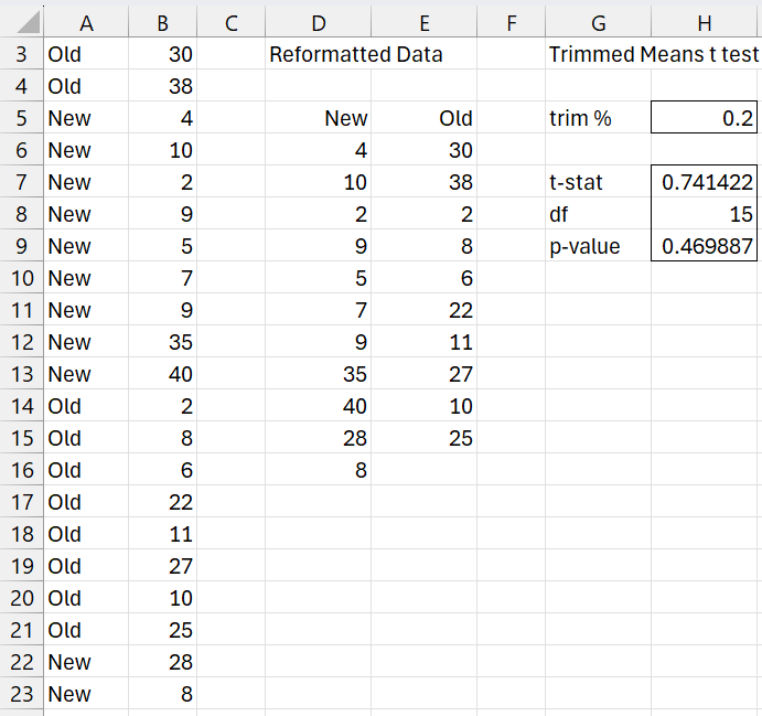 You can also use this data analysis tool with data in standard (stacked) format. Figure 3 shows the results for the Trimmed Means t Test using the data in range A3:B23. This time we need to insert A3:B23 in the Input Range 1 field of the dialog box shown in Figure 1 and leave Input Range 2 empty. We also need to uncheck Column headings included with data, check Use standard (stacked) format, and select the Trim Means t option.