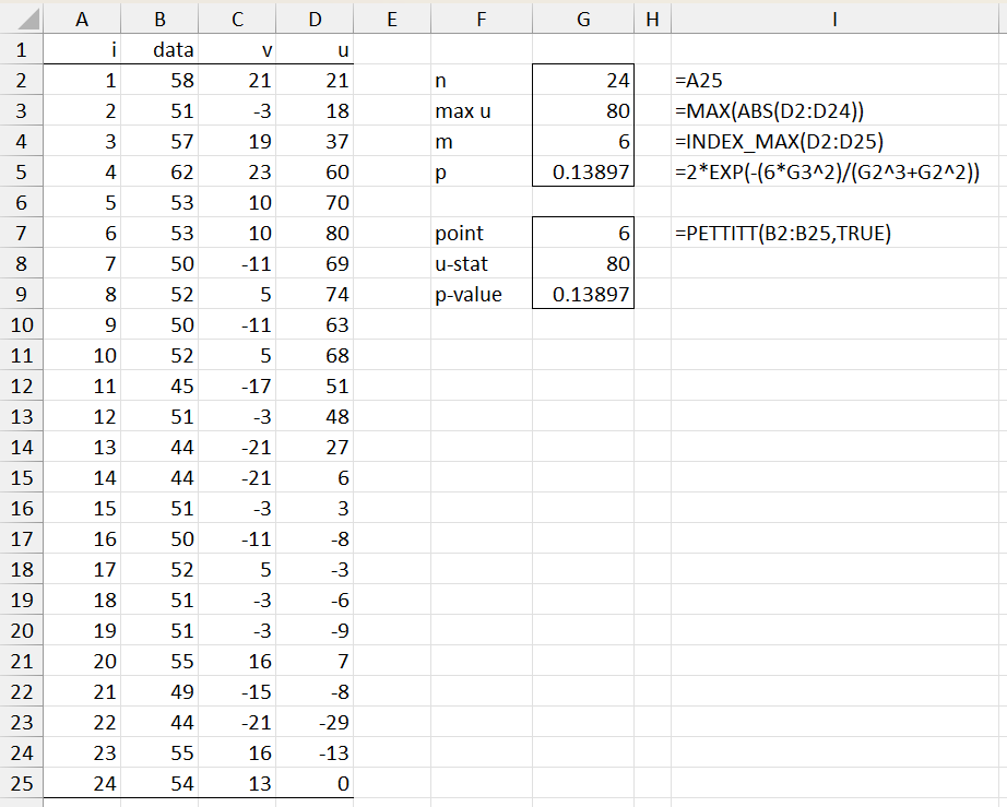 We see that p-value = .008455 (cell H10), which is a highly significant result. We conclude that there is a point change and that it occurs at time = 6.