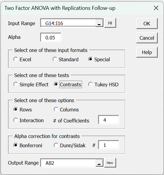 We have three options for how to tell Excel where to find the data for the follow-up analysis. We chose the Special option. In this case, we insert the mean interaction data from the Two Factor ANOVA output (namely, range G14:I16 from Figure 2). We choose the Rows option for Contrasts since we want to compare Cold and Humid.